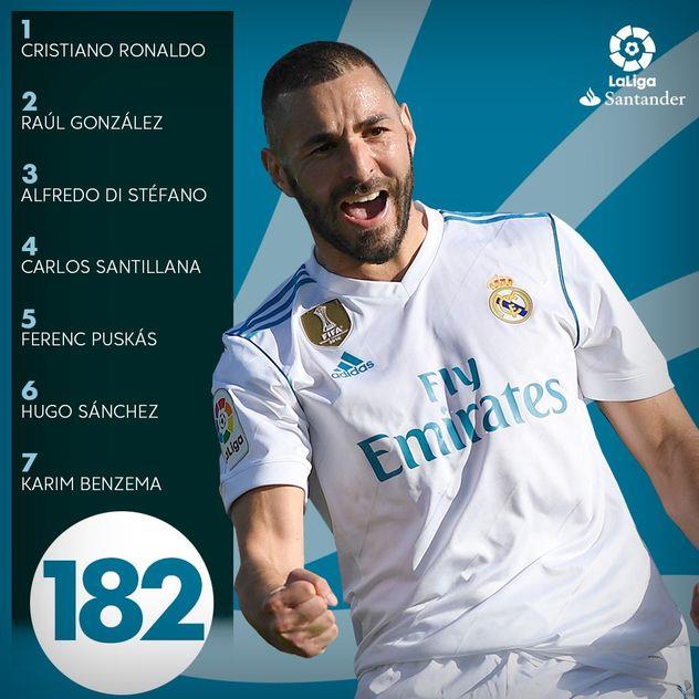 7 — Бензема догнал Пако Хенто в списке лучших бомбардиров Реала за всю историю — 182 гола за Мадрид и 7-й исторический показатель.