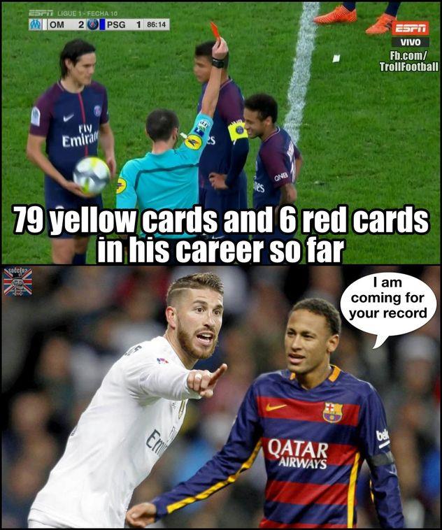 Неймар за свою карьеру получил 79 желтых и 6 красных карточек. Рамос одобряет.