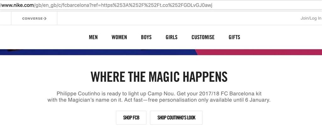"Коутиньо готов зажечь на Камп Ноу. Покупайте форму Барселоны с именем Волшебника. Бесплатна персонализация дизайна доступна только до 6 января", – написали на сайте Nike.