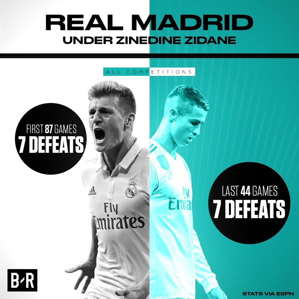7 — За последние 44 матча команда Зинедина Зидана потерпела столько же поражений во всех турнирах (7), сколько за первые 87 игр.
