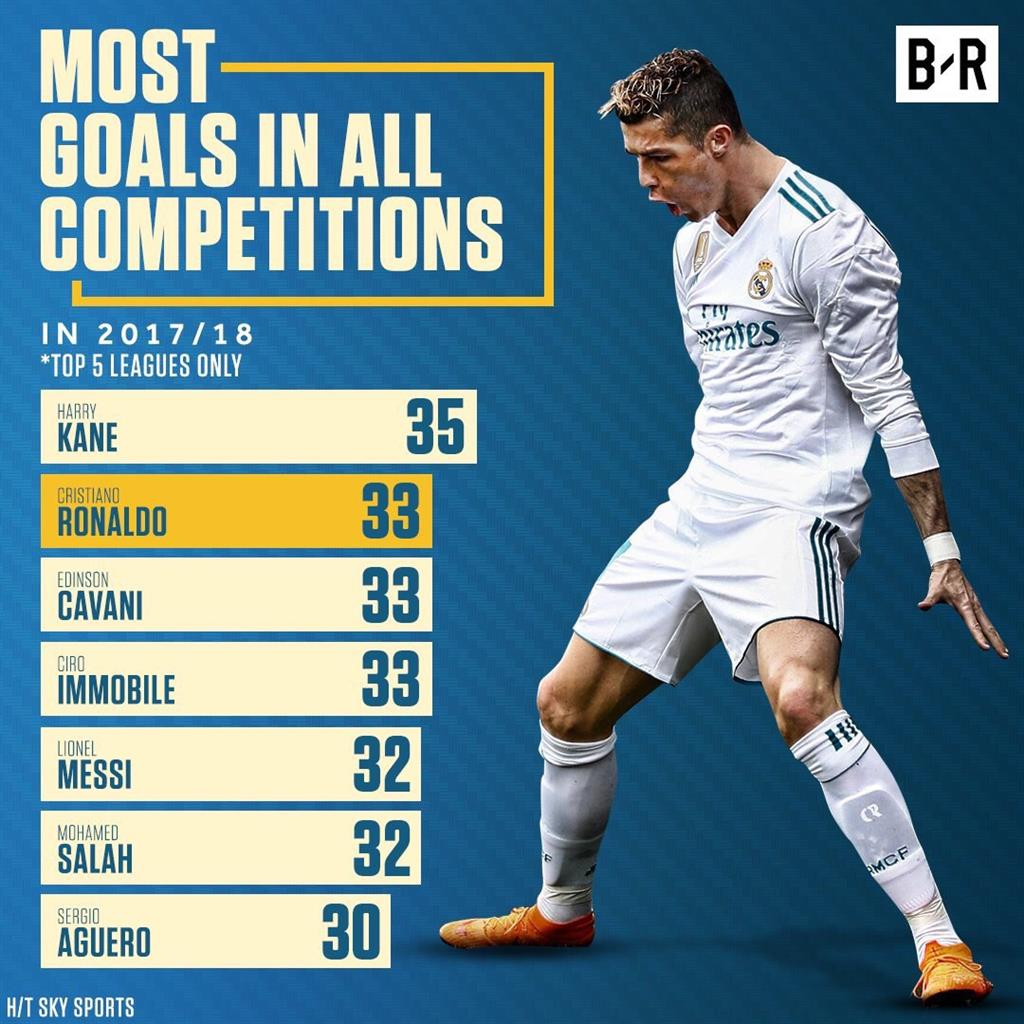 33 — Роналду догоняет Харри Кейна в показатели голы во всех турнирах за сезон.