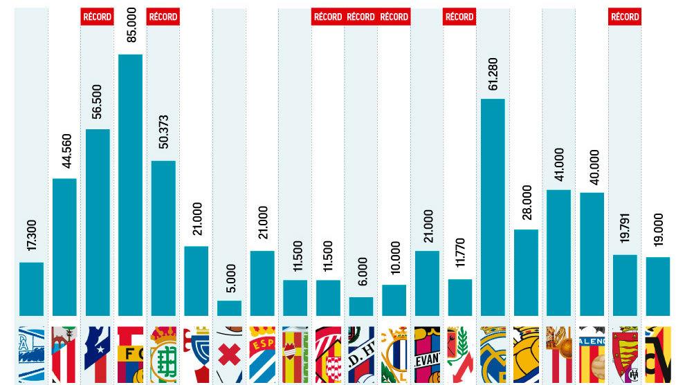 Сразу семь клубов из двадцати, которые учавствуют в высшем дивизионе чемпионата Испании, побили собственный рекорд продажи сезонных абонементов.