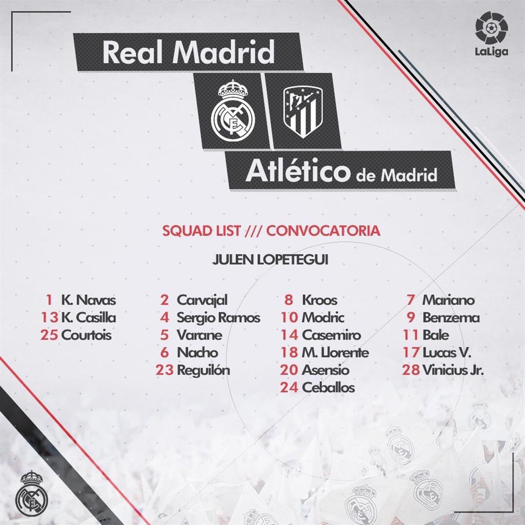 В данном матче, как известно, "бланкос" не смогу рассчитывать на травмированного защитника Марсело, которого в заявке заменил молодой Серхио Регилон. Также место в ней нашлось 18-летнему нападающему Винисиусу Жуниору, а вот правый бек Альваро Одриосолоа, приобретенный мадридцами летом, остался вне состава на поединок.