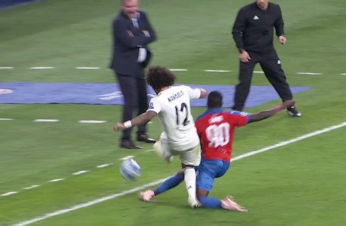 На фланге в ногу бразильца влетел соперник, и Марсело покинул пределы поля с помощью врачей, оставив свою команду в меньшинстве, ведь на тот момент все три замены были использованы.
