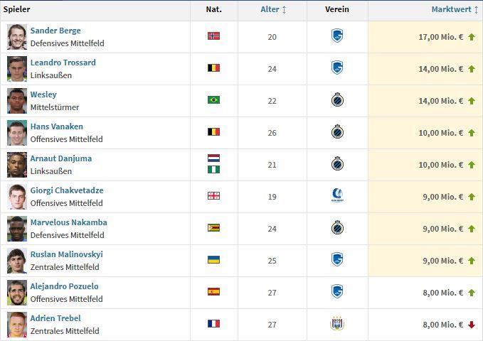 Самым дорогим игроком чемпионата Бельгии является одноклубник Малиновского 20-летний норвежец Сандро Берге (17 млн). Второе место делят еще один представитель Генка Леандро Тросар и бразилец Уэсли из Брюгге. Малиновский разделяет 6-8 места с Георгием Чакветадзе и Марвелусом Накамба.