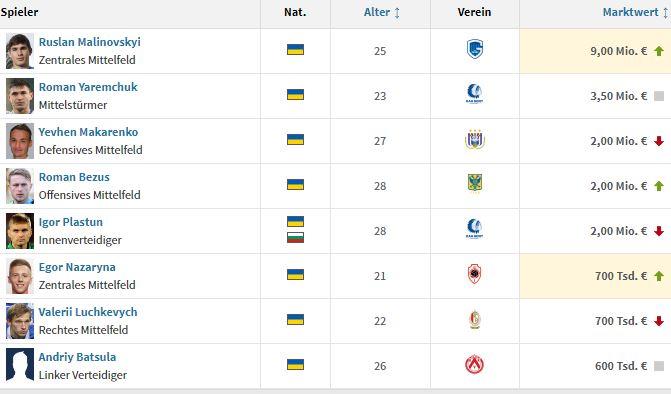 Хавбек сборной Украины и бельгийского Генка Руслан Малиновский оценивается порталом Transfermarkt в 9 млн евро.