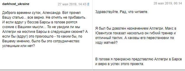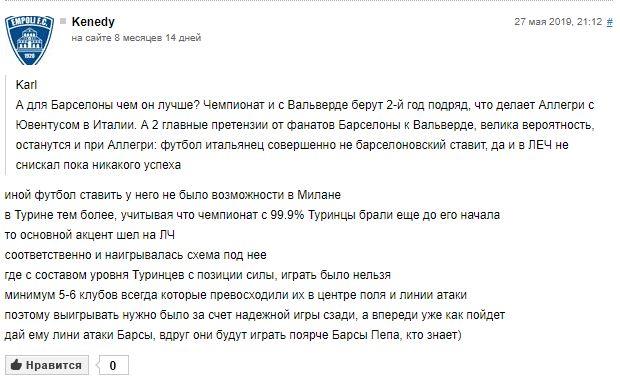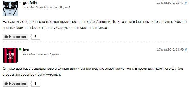 Мнение пользователей нашего сайта по кандидатуре Аллегри нельзя назвать единым. Кто-то хотел бы увидеть, как справится итальянец с Барселоной