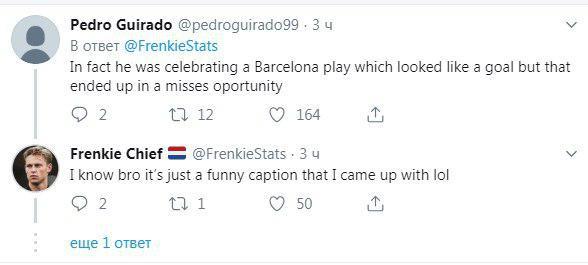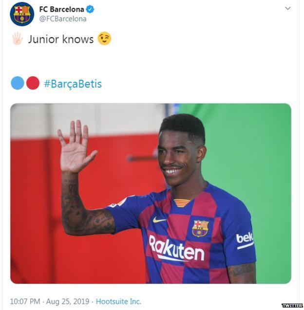 После победы Барселоны над Бетисом в твиттере каталонской команды появилась "интересная" публикаций. На фото размещен защитник "блаугранас" Хуниор Фирпо, который был куплен летом как раз у Бетиса. На изображении футболист машет рукой, но СММщик Барселоны явно намекает что Хуниор показывает цифру 5 — именно столько забили "сине-гранатовые". Подпись окончательно развеивает сомнения относительное этого: "Хуниор знает".