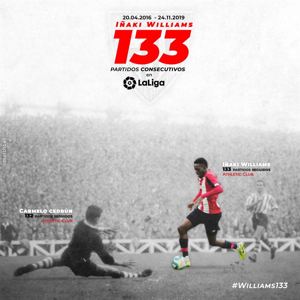 Форвард Иньяки Вильямс – новый рекордсмен Атлетика из Бильбао по количеству матчей в Ла Лиге подряд. Он провел 133-ю игру кряду и обошел предыдущего рекордсмена, голкипера Кармело Седруна, который провел 132 игры без пропусков.