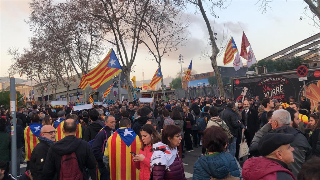 Перед стадионом Камп Ноу, где в 21:00 должен начаться перенесенный матч 10-го тура чемпионата Испании, проходит акция протеста против испанского правительства.