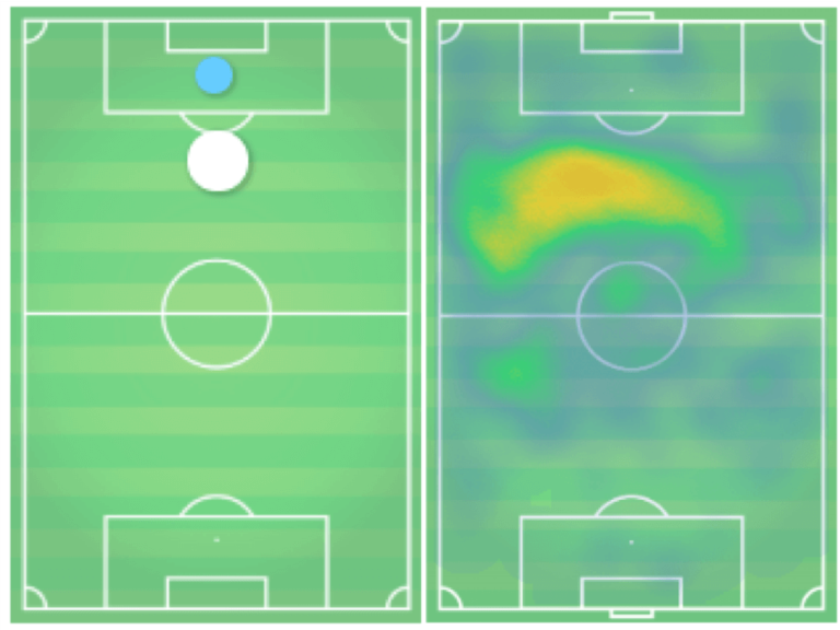 Фламенго прошлый сезон играл со схемами 4-2-3-1 и 4-4-2. При первой формации бразилец выполнял роль центрального атакующего полузащитника, во втором же случае действовал на позиции оттянутого нападающего. Сборная Бразилии до 17 лет, в свою очередь, давала Рейниру куда больше свободы. Там полузащитник действовал по всему периметру последней трети поля с небольшим отклонением влево, что можно увидеть на тепловой карте.