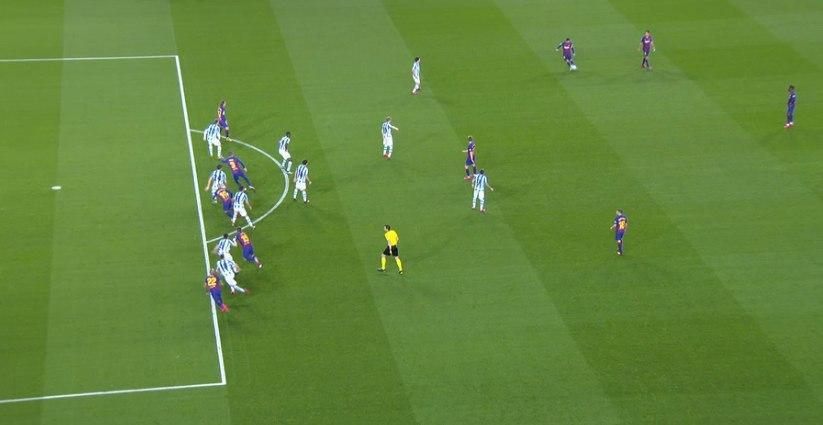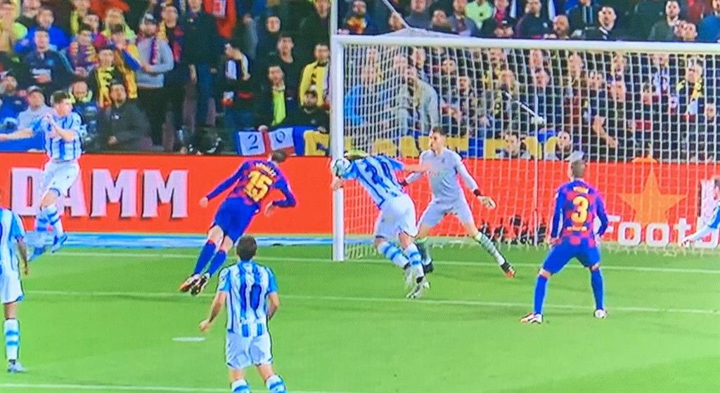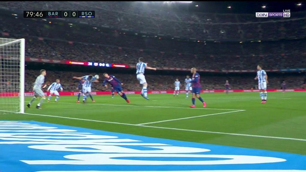 Мяч летел в сторону Видаля после подачи Месси, однако чилиец находился в офсайде. Обороняющийся игрок Сосьедада играл до конца и выбил недалеко мяч, после чего его подобрал Видаль. Хавбек Барселоны совершил подачу в штрафную, после которой был заработан одиннадцатиметровый удар. Еще раз хочется напомнить, что в данной ситуации Мануэра пересматривал VAR.