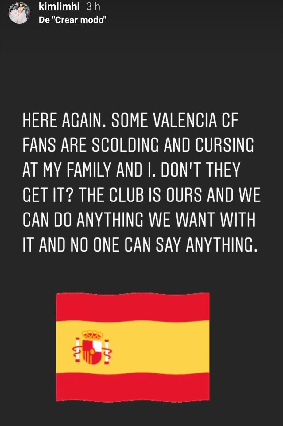 "Некоторые фанаты Валенсии ругаются и ругают мою семью и меня. Разве они не понимают? Клуб наш, и мы можем делать с ним все, что захотим, и никто не может ничего сказать", — написала Ким Лим в своем Instagram-аккаунте.