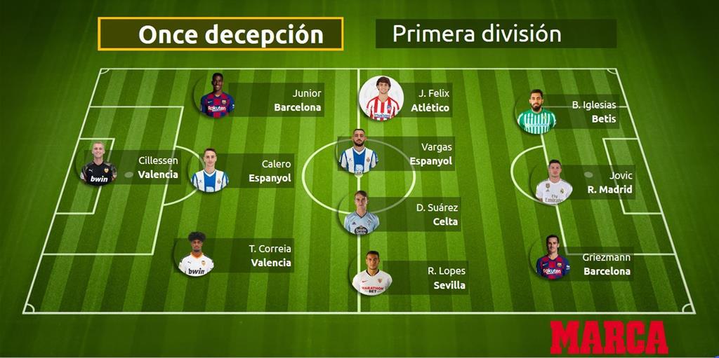 В сборной разочарований сезона в Ла Лиге по версии Marca оказалось по два футболиста Валенсии, Барселоны, Эспаньола, а также по одному от Атлетико, Реала, Севильи, Сельты и Бетиса.