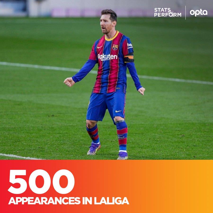 Матч 17-го тура чемпионата Испании против Уэски стал 500-м в Ла Лиге для форварда Барселоны Лионеля Месси — сообщает ОРТА.