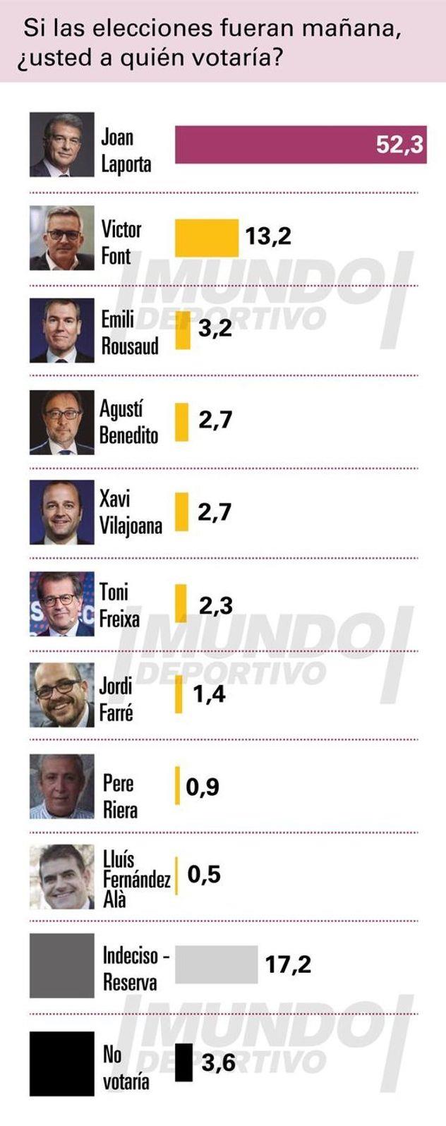 Испанское издание Mundo Deportivo за неделю до официальной даты начала финального этапа голосования (24 января) провело опрос среди 220 членов клуба, которые имеют право голоса на предстоящих выборах. Абсолютные симпатии респонденты выразили Жоану Лапорте (52,3%), который попросту не оставляет шансов своему ближайшему преследователю в лице Виктора Фонта (13,2%).