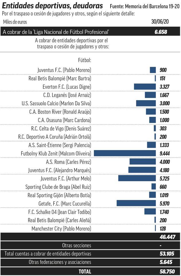 Однако подобные финансовые задолженности не являются редким явлением, поэтому у Барселоны имеется свой ряд должников. Наиболее крупный из их числа — санкт-петербургский Зенит, который до сих пор не выплатил почти 9,5 млн евро за трансфер бразильца Малкома. Кроме того, подобным отличились туринский Ювентус — 5,7 млн евро за Артура Мело и 4 млн евро за Алехандро Маркеса, а также Хетафе — почти 6 млн евро за Марка Кукурелью.
