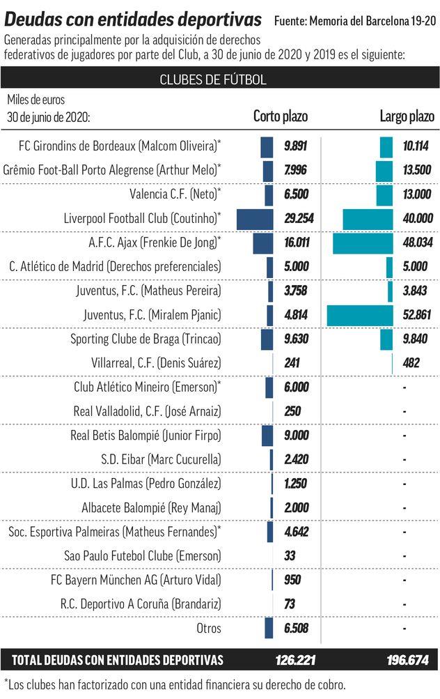 Финальной цифрой по платежам в краткосрочной перспективе в адрес других клубов для "блаугранас" стала сумма 126 млн евро, что в долгосрочном проекте может развиться в задолженность в 197 млн евро.