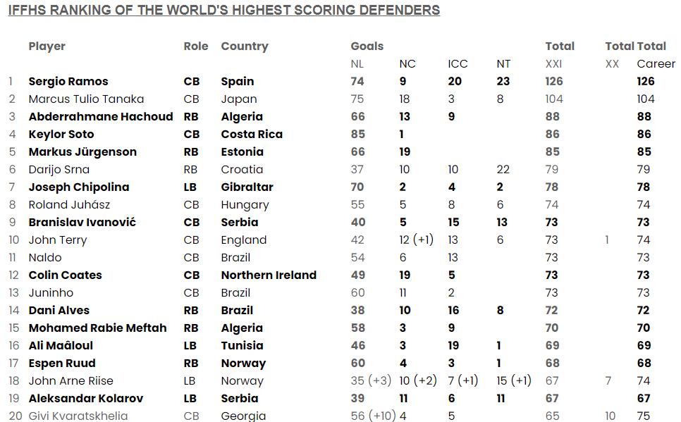 Международная федерация футбольной истории и статистики IFFHS опубликовала рейтинг самых забивных защитников в период с 2001 по 2020 год.
