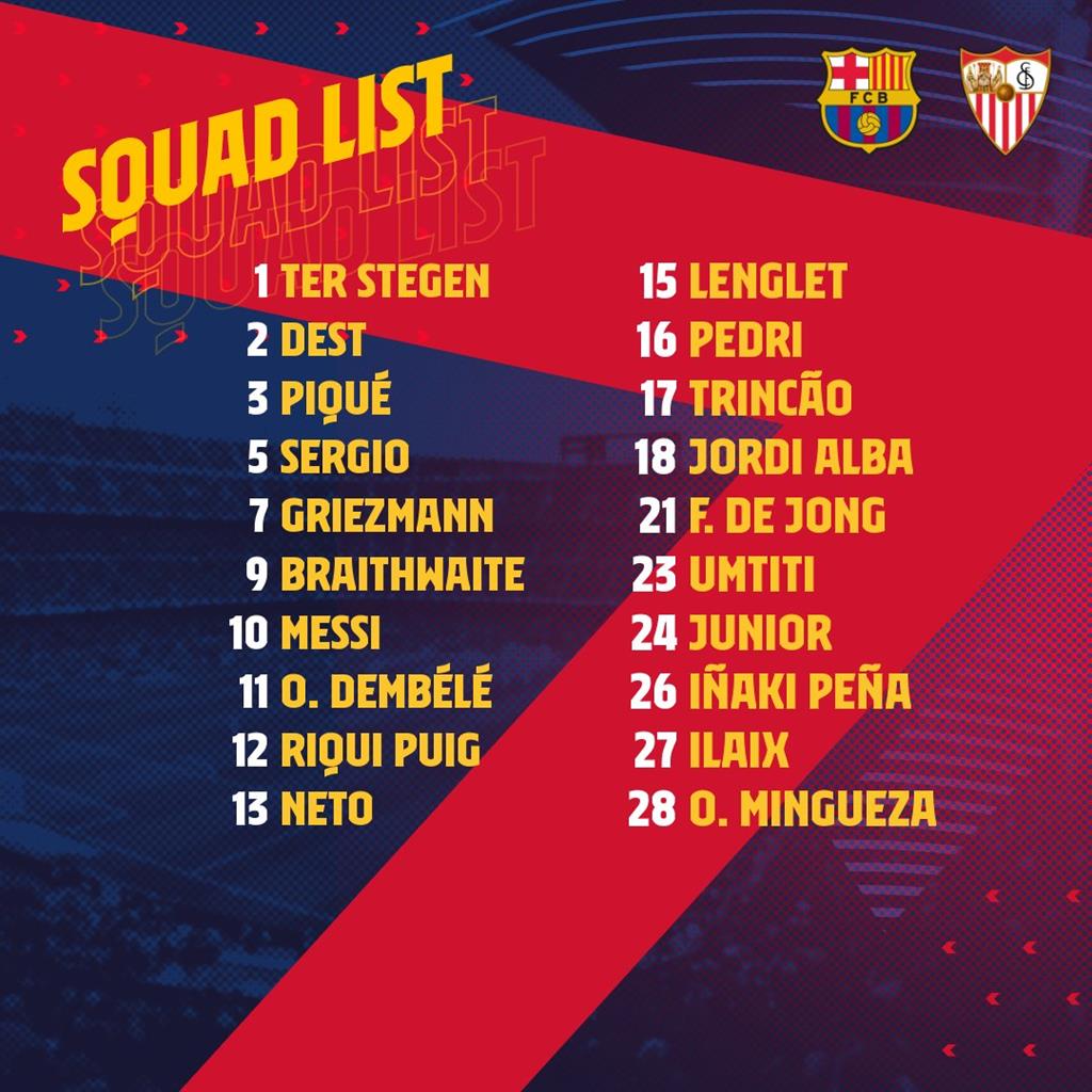 В список игроков, попавших в заявку на кубковый матч вошло 20 футболистов, среди которых отсутствуют Рональд Араухо и Миралем Пьянич, но вместо этого отмечаем возвращение Педри, который успел восстановиться после травмы.