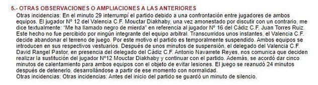 "На 29-й минуте я прервал матч из-за конфликта между футболистами обеих команд. Игрок Валенсии под №12 Муктар Диакаби, после того, как ему показали предупреждение за конфликт с соперником, обратился ко мне, сообщив, что в его адрес последовало оскорбление от игрока Кадиса под №16 Хуана Торреса Руиса (более известный как Хуан Кала), который назвал его "с***ый черный".