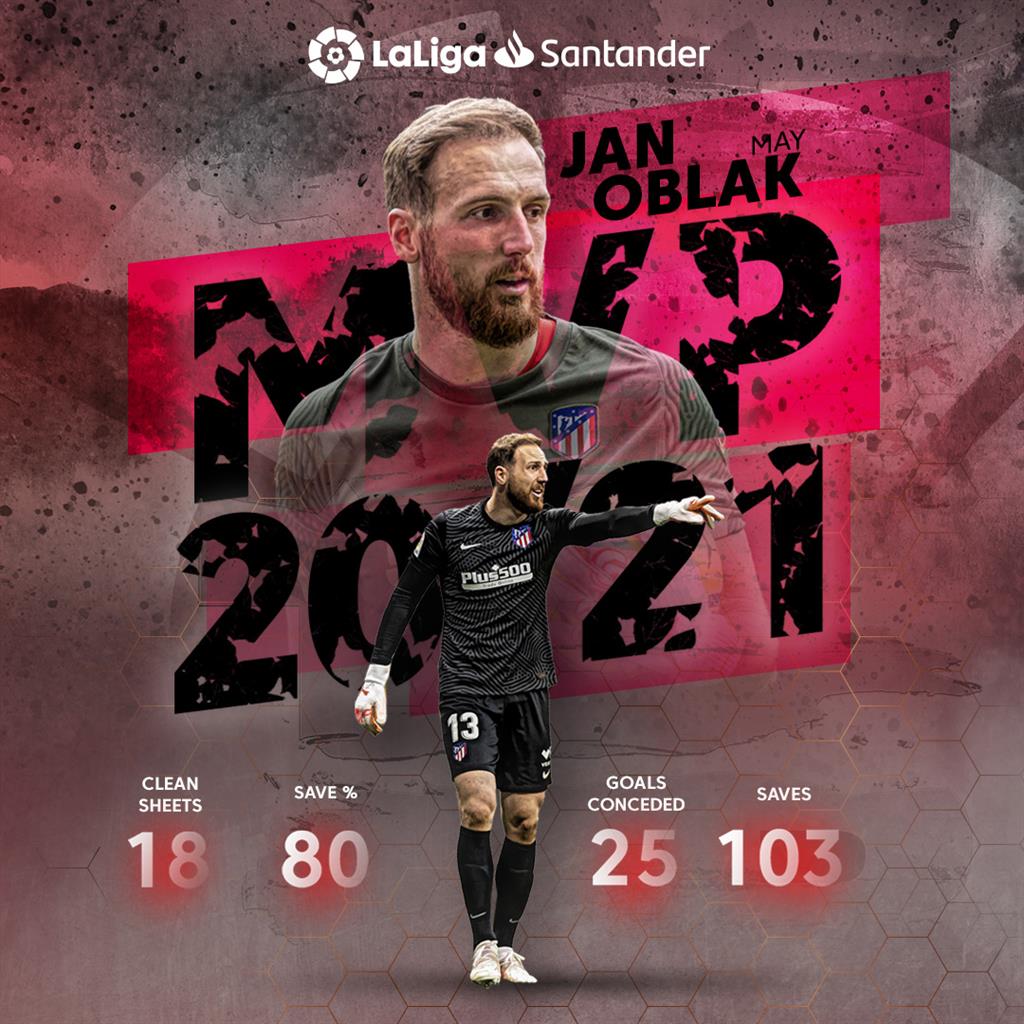 Голкипер мадридского Атлетико Ян Облак признан лучшим футболистом минувшего сезона в испанской Ла Лиге. Об этом сообщает пресс-служба турнира.