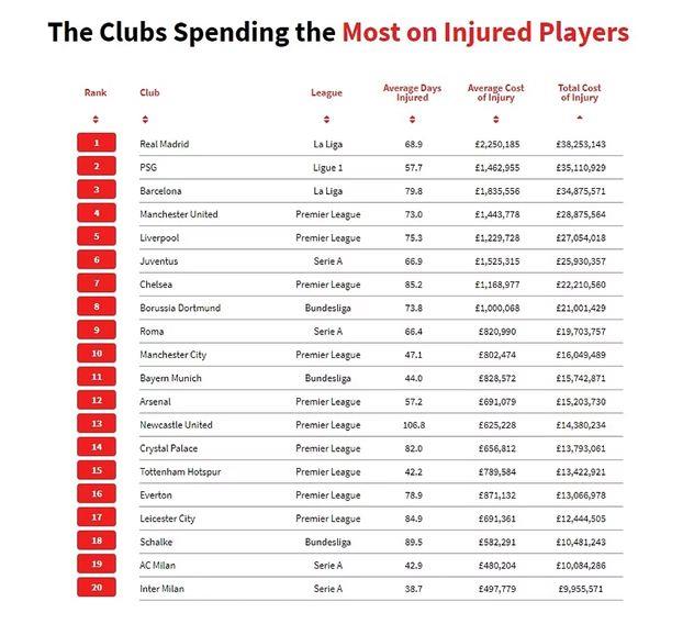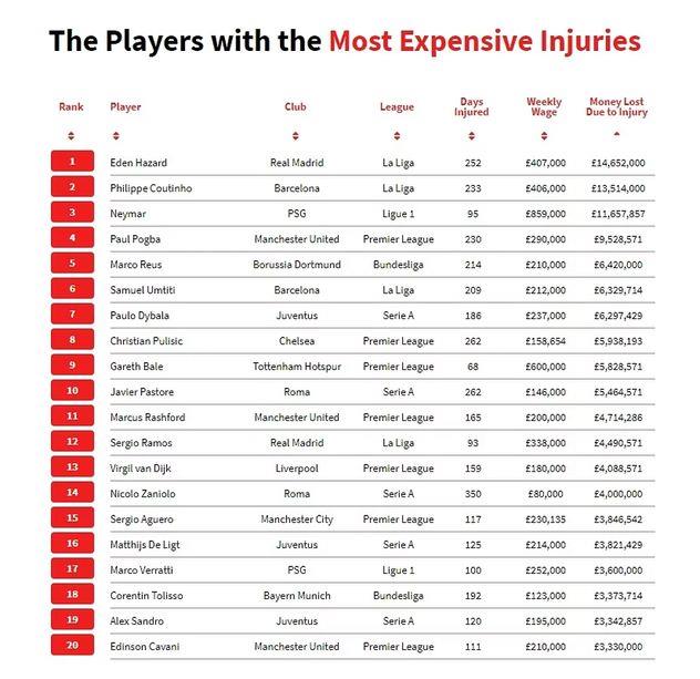 Не должно вызывать удивления тот факт, что один из наиболее травматичных игроков европейских топ-чемпионатов, нападающий мадридского Реала Эден Азар, оказался на вершине сводной таблицы, благодаря количеству пропущенных игровых дней и размеру своей заработной платы.