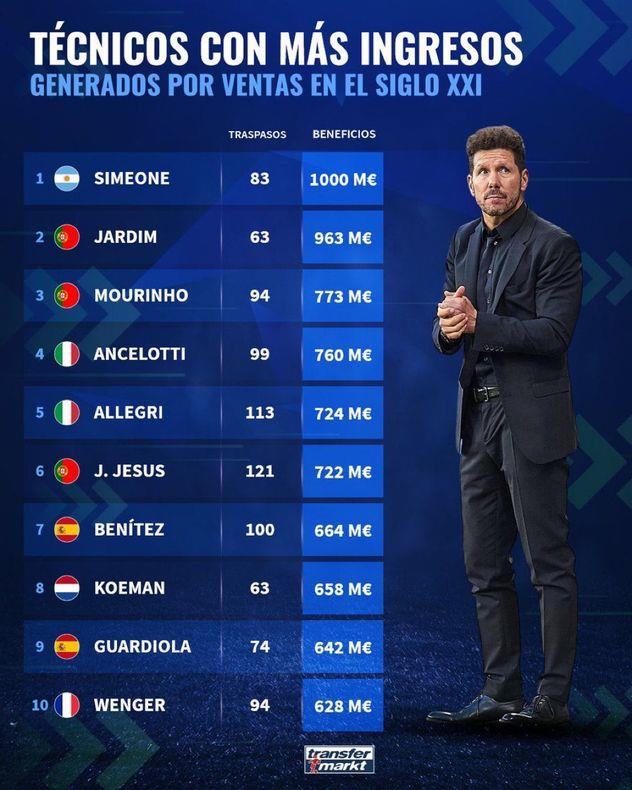 Эта сумма вывела его на абсолютную лидерскую позицию в рейтинге наставников по аналогичному показателю, в то время как у ближайшего преследователя в лице Леонарду Жардима, на данный момент возглавляющего аравийский Аль-Хиляль, набралось за тренерскую деятельность 963 млн евро.
