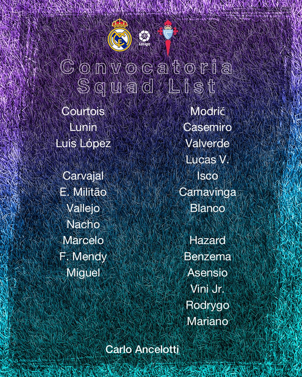 В списке названных игроков главным тренером "сливочных" Карло Анчелотти оказались восстановившийся после травмы Лука Модрич и Эден Азар, а также новичок команды Эдуардо Камавинга.