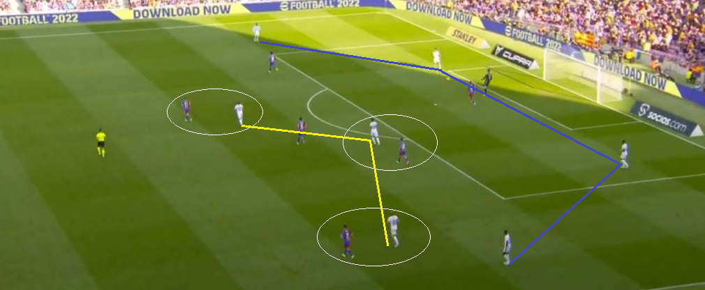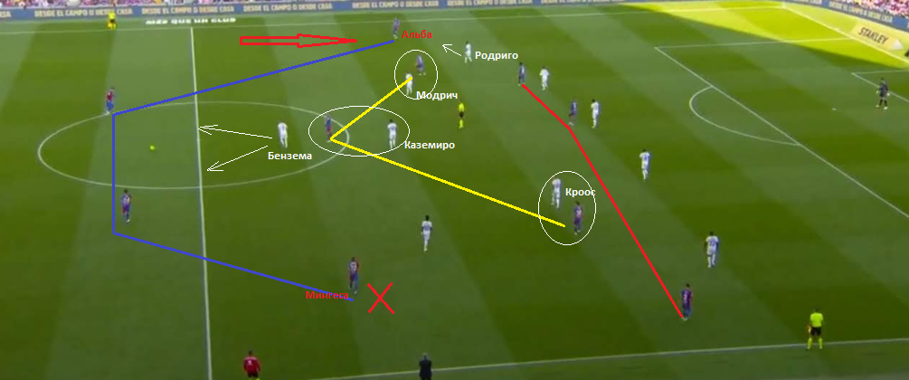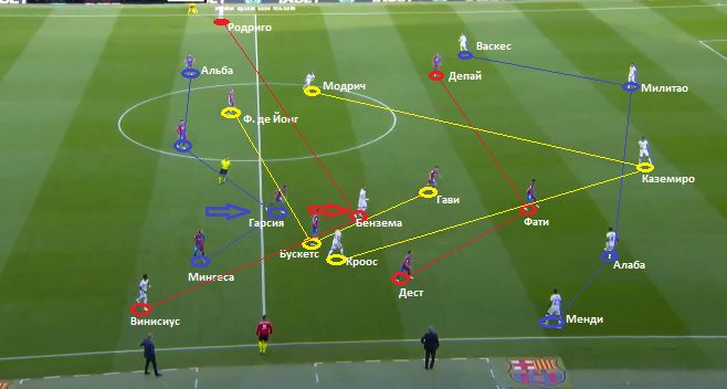 На скриншоте выше – структура позиционной атаки хозяев поля и ориентировки игроков Реала в деструктивной фазе. Бензема осуществлял относительное давление на центрбеков Барсы, пытаясь по возможности перекрывать вектор на Бускетса, которого с небольшим зазором контролировал Каземиро. "Восьмерки", как мы уже отметили, держали своих коллег, а дисциплинированный Родриго встречал создающего ширину атаки Барселоны — Альбу. Левый вингер Барсы, как и в матче с Динамо, смещался в полупространство, открывая зону для подключений Альбы.