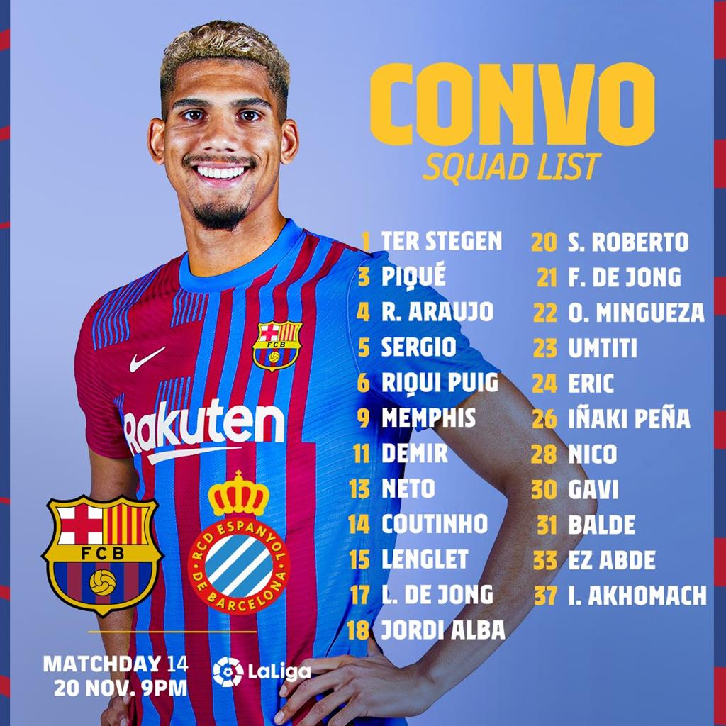 Хозяева поля объявили заявку на дебютный матч Хави Эрнандеса во главе клуба. Как и сообщали испанские СМИ, поединок с "попугаями" пропустят Дембеле и Педри — оба футболиста не успели восстановиться от полученных травм.