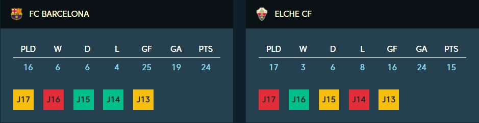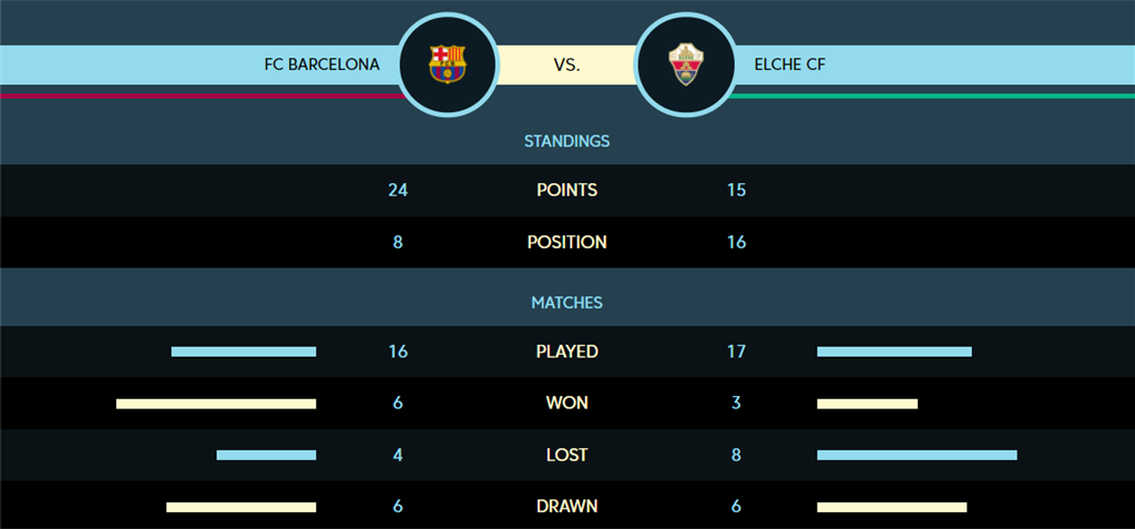 В одном из матчей 18-го тура испанской Ла Лиги нас ожидает противостояние между Барселоной и Эльче, которое пройдет на стадионе Камп Ноу.