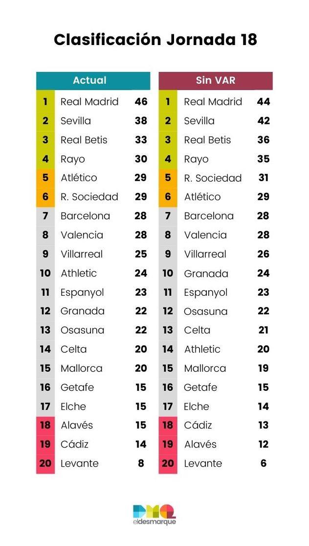 Испанские журналисты решили подсчитать количество очков, которые набрали бы клубы из их национального первенства, если бы технология VAR не присутствовала на футбольных матчах.
