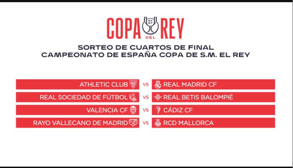 В остальных парах сыграют Реал Сосьедад и Бетис, Валенсия и Кадис и Райо Вальекано с Мальоркой.