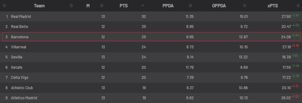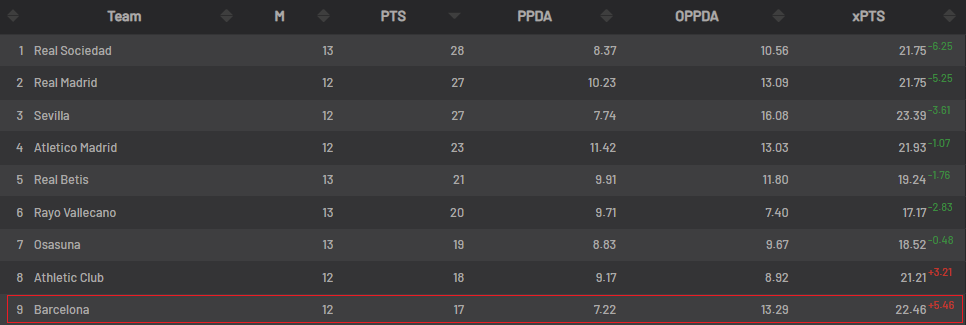 Под руководством Хави команда набрала на 7 очков больше. Интересно, что по потерянным очкам (xPTS) на первом отрезке команда Кумана явно недобирала очков. Если кто не знает, в xPTS 3 очка начисляется за более высокий показатель xG в матче. При Хави заметно вырос уровень реализации голевых моментов. На мой взгляд, это связано с более четкой, эффективной и понятной для игроков системой игры, а также с уровнем концентрации и моральным состоянием игроков.