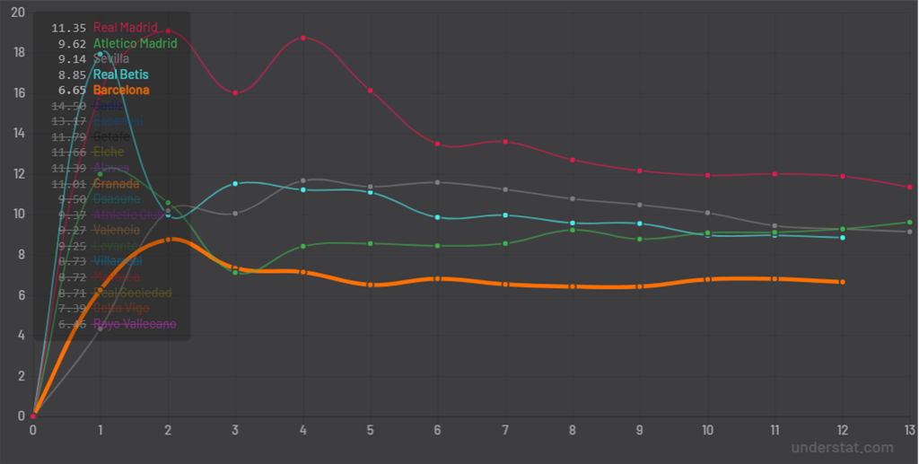 Это график показателей интенсивности прессинга (PPDA) пятерки лидеров чемпионата в период работы Хави. Кривая линия Барсы — оранжевая. Эффективность высокого прессинга команды еще далека от идеала, но она заметно растет. Визуальные впечатления подкрепляют статистические данные. Если до Хави показатель PPDA составлял 7,22, то при нем Барса перешагнула через семерку — 6,65. Лучше цифры только у Райо Вальекано, но среди ведущих команд лиги Барса стабильно сохраняет лидерство.