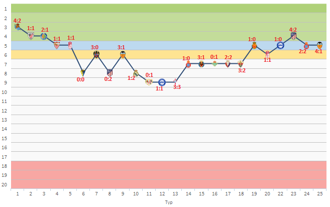 Здесь отчетливо прослеживается регресс при Кумане и прогресс при Хави. Вертикальная ось отображает места в турнирной таблице, горизонтальная – номер тура.