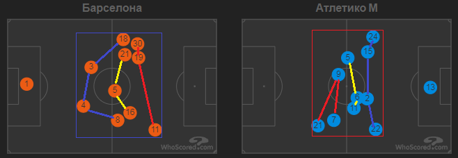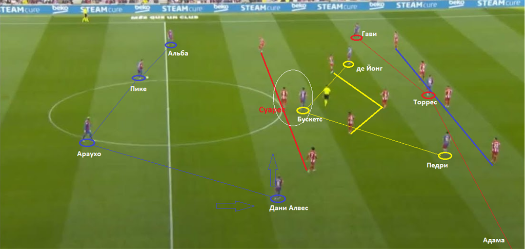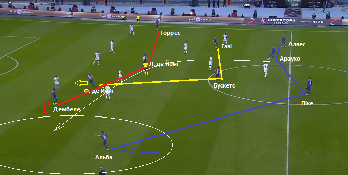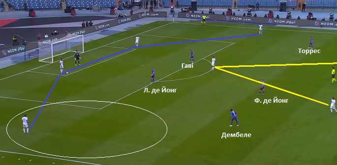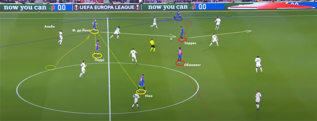 - Первый матч с Наполи. В данном случае, де Йог – первый, Торрес – второй, Альба – третий игрок в комбинации.