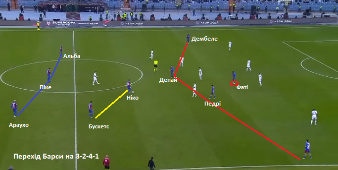 - Барселона систематически перегружает свой левый фланг, а на правом фланге создает изоляцию для эффективного в игре 1 в 1 вингера, буть то Траоре или Дембеле.