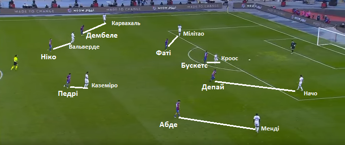 К примеру, в матче с Реалом Дембеле осознанно оставлял большой зазор с фулбеком Мадрида, смещаясь ближе к центру поля. Вероятно, это было частью плана на матч. Барса предлагала Реалу начинать свои атаки именно через эту зону, но как только мяч оказывался у правого защитника команда Хави активировала интенсивный прессинг, стараясь перекрывать векторы возможных передач.