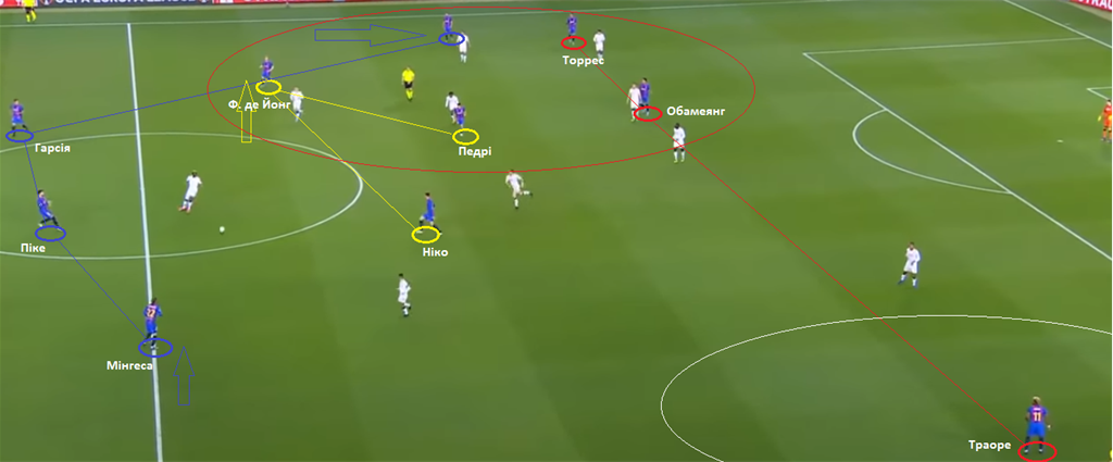 Вот хороший пример из матча с Наполи. Френки де Йонг страхует Альбу, номинальный форвард и одна из условных "восьмерок" также смещаются в полуфланг, а Траоре остается в изоляции.