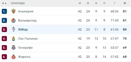 Нагадаємо, що перші два місця з Сегунди виходять безпосередньо в Ла Лігу, а команди, що посіли з третього по шосте місце, боротимуться між собою в стикових іграх.