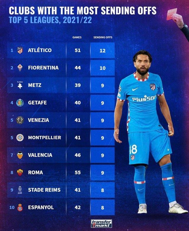 Третє місце у цьому списку поділили відразу шість команд – Метц, Хетафе, Венеція, Монпельє, Валенсія та Рома. Усі вони отримали дев'ять видалень.