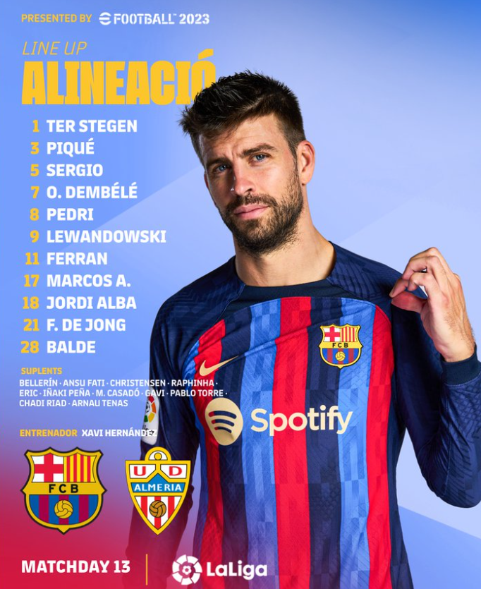 О 22:00 на Камп Ноу стартує матч Барселона — Альмерія в рамках 13-го туру іспанської Примери. Для захисника каталонців Жерара Піке цей поєдинок стане останнім в професійній кар'єрі. На прощальний матч 35-річний захисник вийде в основному складі.