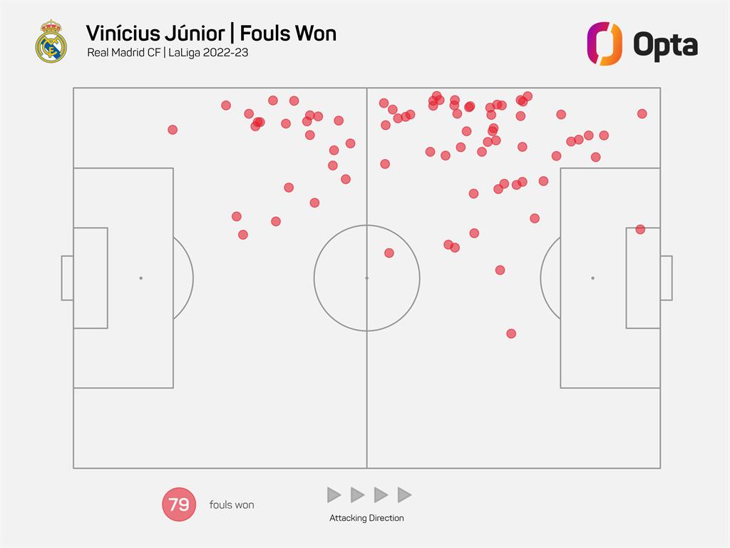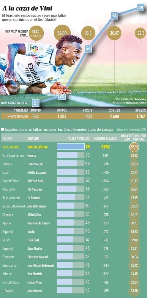 Очолює рейтинг нападник мадридського Реалу Вінісіус Жуніор, на якому в іспанській Ла Лізі сфолили 79 разів. Якщо взяти зіграні хвилини – 1762, то на бразильці фолять кожні 22,3 хвилини.