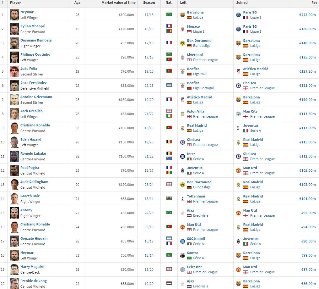 Лідером рейтингу є трансфер Неймара з Барселони до ПСЖ за 222 млн євро. За ним іде перехід Кіліана Мбаппе з Монако до ПСЖ за 180 млн євро, а трійку найкращих доповнює трансфер Усмана Дембеле з Боруссії Д до Барселони за 140 млн євро.