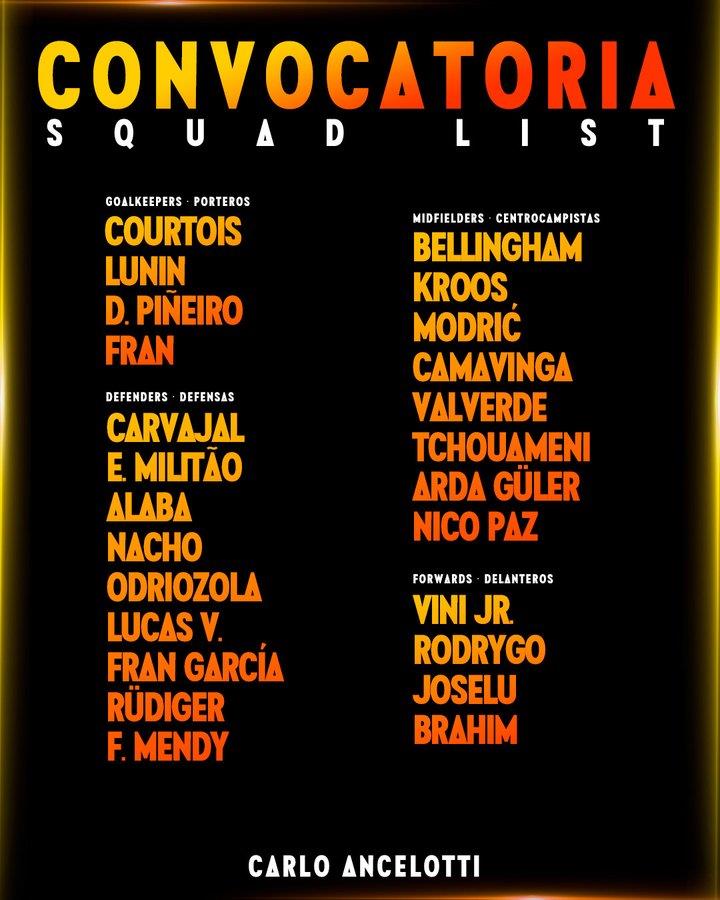 Прес-служба "вершкових" опублікувала список гравців, які відправляться разом із тренерським штабом Карло Анчелотті до США.