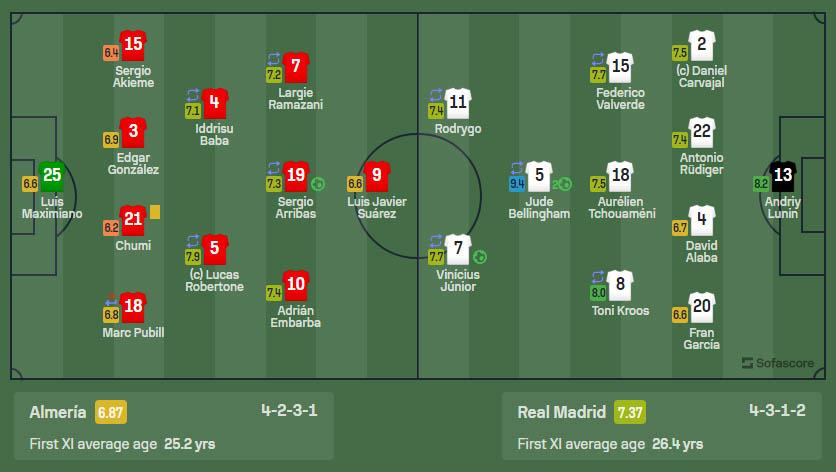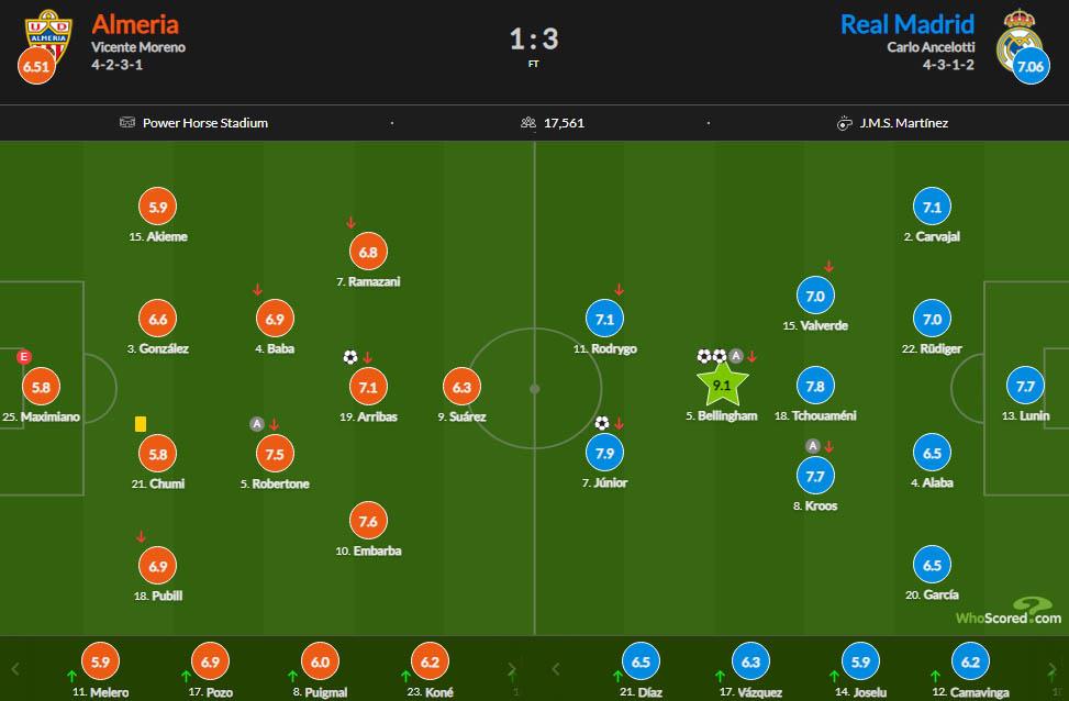 Найкращим гравцем був визнаний півзахисник "вершкових" Джуд Беллінгем, який оформив дубль та віддав гольову передачу. Його оцінки – 9,1 та 9,4 балів відповідно.