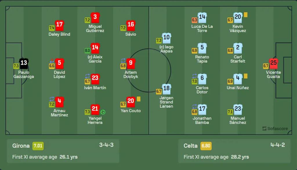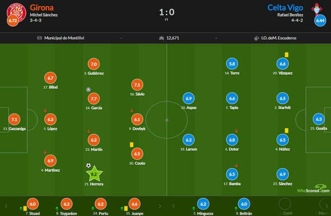 Український форвард Артем Довбик, який вийшов у стартовому складі Жирони, отримав оцінки 6,1 та 6,8 відповідно.