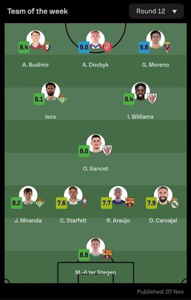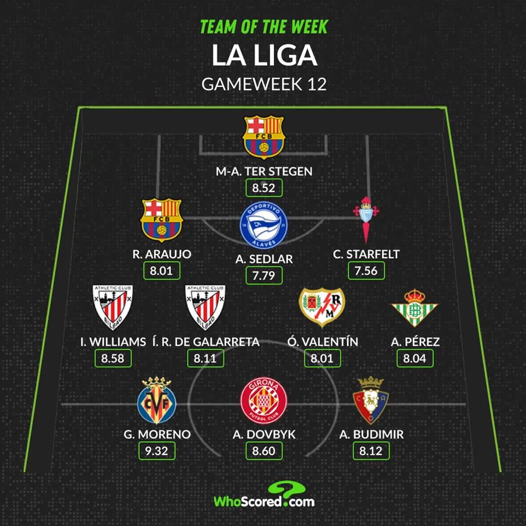 Статистичні портали WhoScored та SofaScore опублікували символічні збірні за підсумками 12 туру іспанської Ла Ліги.